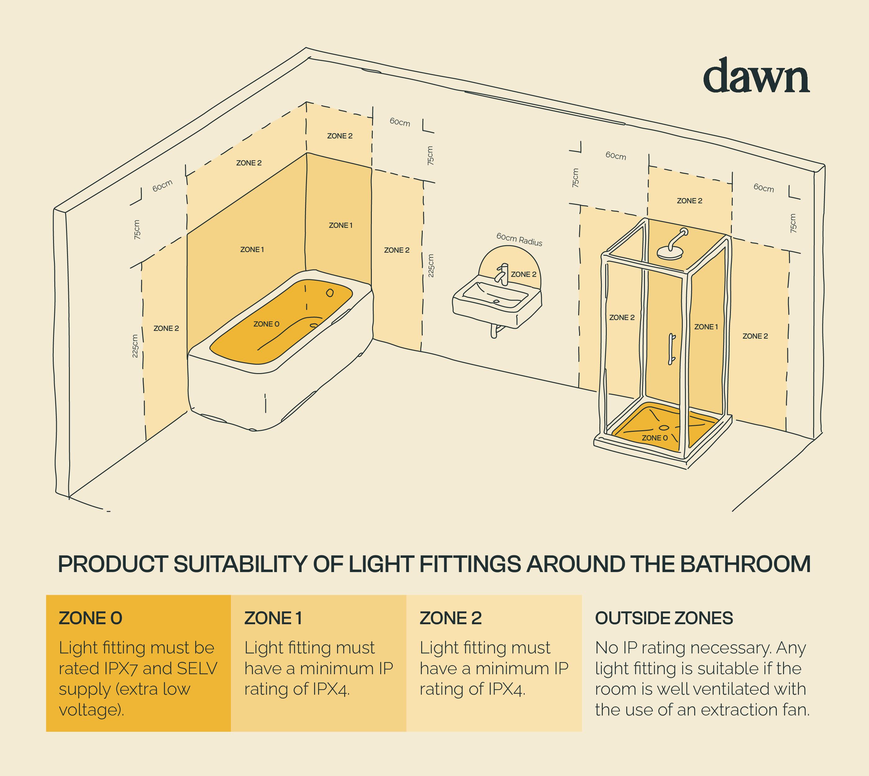 Bathrooms are divided into zones based on how close they are to water, and each zone has a minimum requirement. In most bathroom areas, like around your vanity or mirror, lights need to be rated for water splashes. This is where IP44 fittings are commonly used, as they meet the minimum requirement for these zones.
