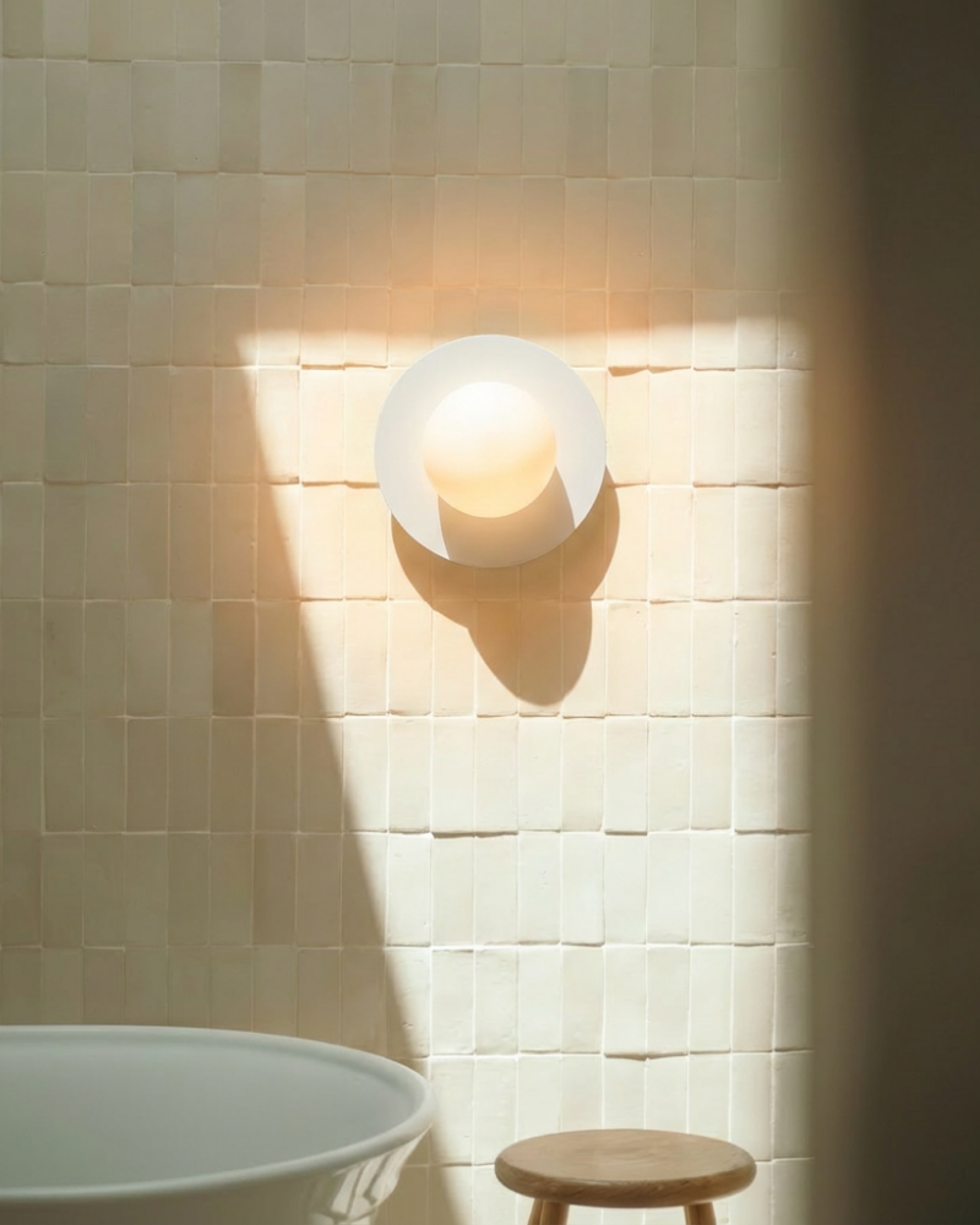 Wall lights should sit comfortably at or just above eye level and align naturally with your mirror. In narrower bathrooms, choosing a fitting that doesn’t extend too far out helps keep the space functional and easy to move through.